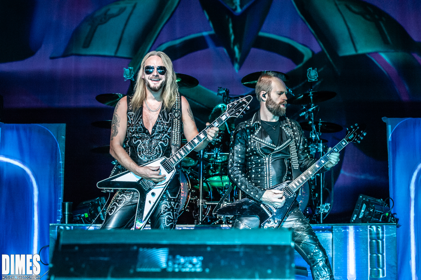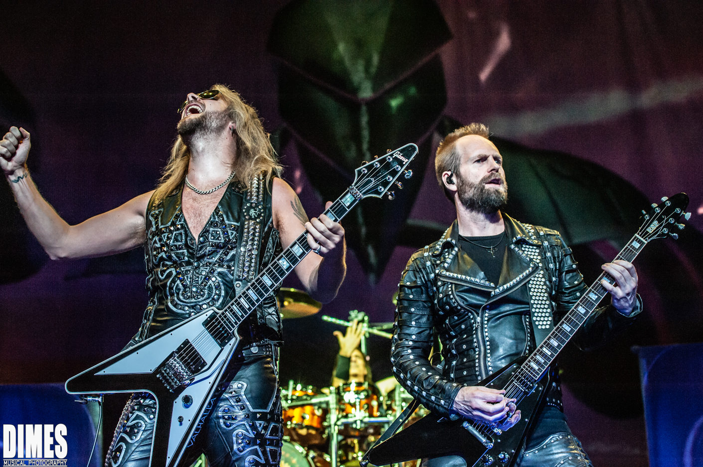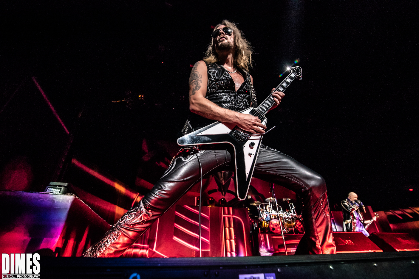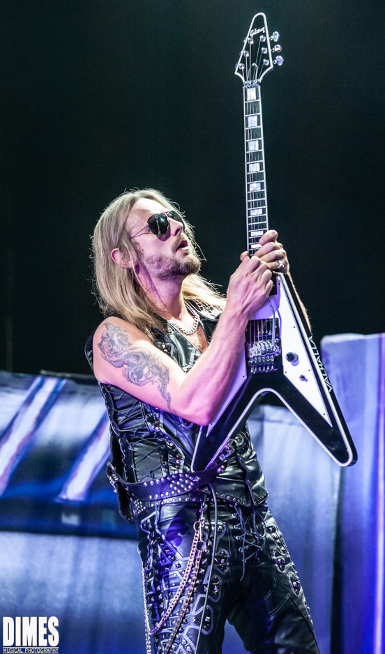 I know its old news, but in years past the absence of the beloved K. K. Downing (quit), and Glenn Tipton (illness), was a shock. It was honorably less obvious on this tour. Last year’s tour brought out Glenn Tipton to play one or two of the classic songs with the newer guitarists taking a bit of a backseat, allowing him to shine. This year didn’t allow us to give our love to Glenn Tipton except through a video projected behind the band from time to time. Looking seasoned, and where he should be, Richie Faulkner, did a fantastic job not “as” K. K. Downing, but respectfully as his own character and solid member of Judas Priest. He was charismatic, technically great, and very fun to watch. Most notably, he had the most interaction with the crowd, sticking his tongue out, posing in classic rock and roll guitar stance, raising his guitar high in the air, and pointing and engaging with each and every fan it seemed. Filling in for Glenn Tipton was the Grammy nominated Andy Sneap. A, songwriter in his own right, sound engineer, record producer, and guitarist, this seasoned music producer convincingly took the coveted stage left position and killed it! Dressed in classic Judas Priest black leather and studs, Sneap and Faulkner did not emulate the classic duo, they made it their own without deviating from the classic sound.