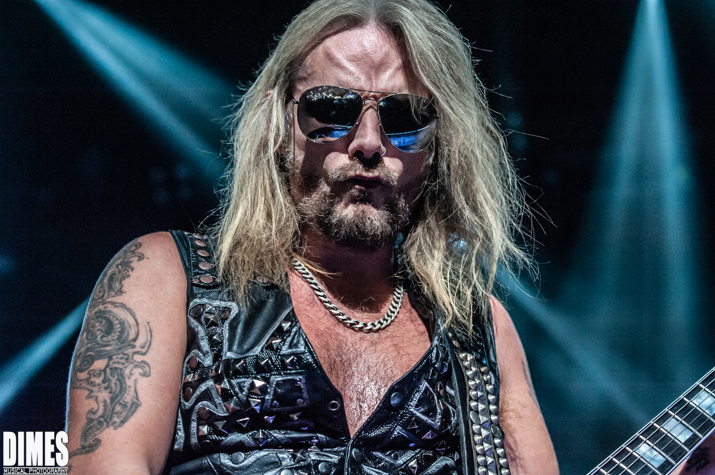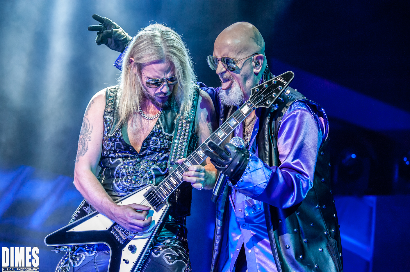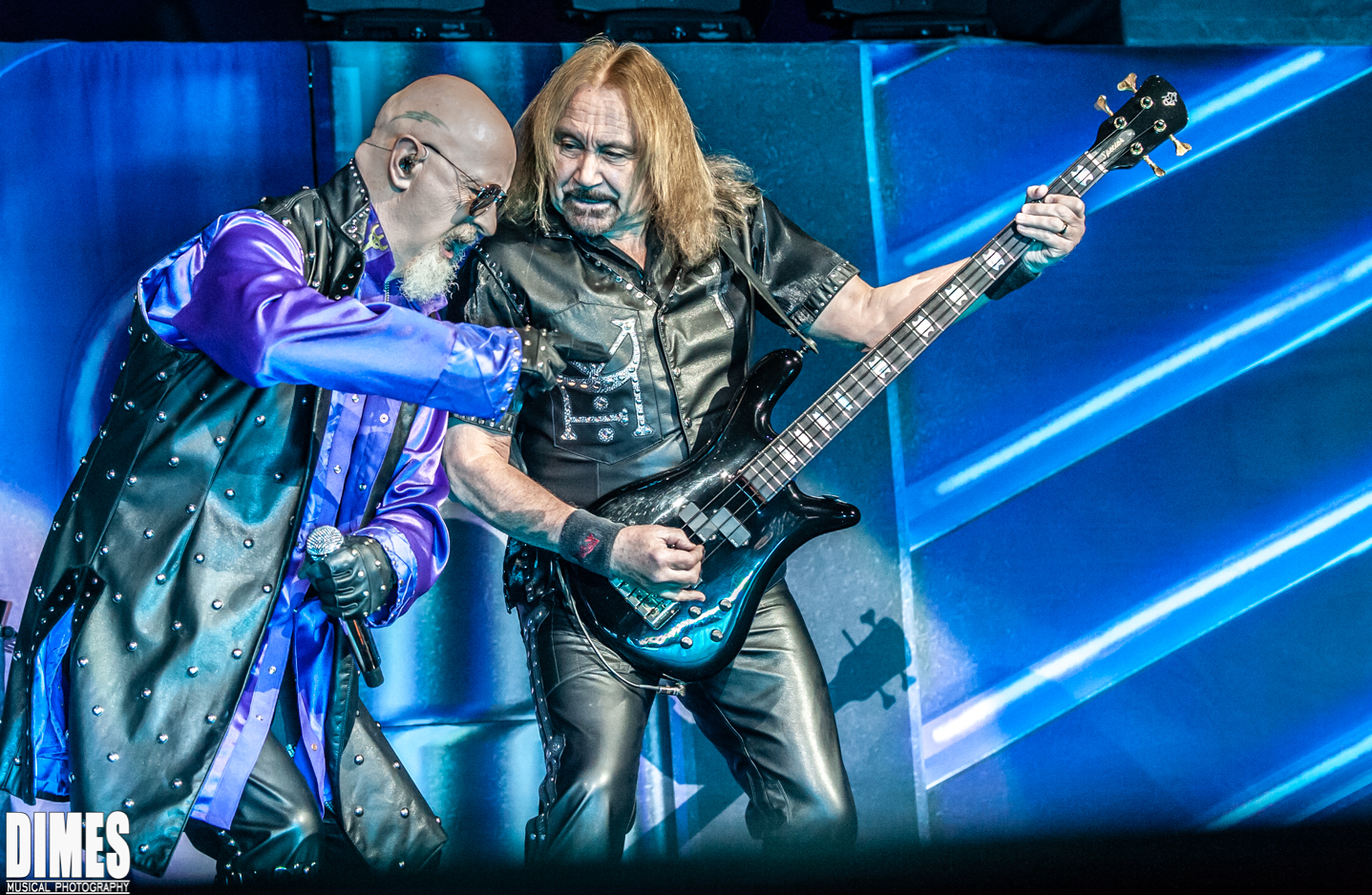 I know its old news, but in years past the absence of the beloved K. K. Downing (quit), and Glenn Tipton (illness), was a shock. It was honorably less obvious on this tour. Last year’s tour brought out Glenn Tipton to play one or two of the classic songs with the newer guitarists taking a bit of a backseat, allowing him to shine. This year didn’t allow us to give our love to Glenn Tipton except through a video projected behind the band from time to time. Looking seasoned, and where he should be, Richie Faulkner, did a fantastic job not “as” K. K. Downing, but respectfully as his own character and solid member of Judas Priest. He was charismatic, technically great, and very fun to watch. Most notably, he had the most interaction with the crowd, sticking his tongue out, posing in classic rock and roll guitar stance, raising his guitar high in the air, and pointing and engaging with each and every fan it seemed. Filling in for Glenn Tipton was the Grammy nominated Andy Sneap. A, songwriter in his own right, sound engineer, record producer, and guitarist, this seasoned music producer convincingly took the coveted stage left position and killed it! Dressed in classic Judas Priest black leather and studs, Sneap and Faulkner did not emulate the classic duo, they made it their own without deviating from the classic sound.